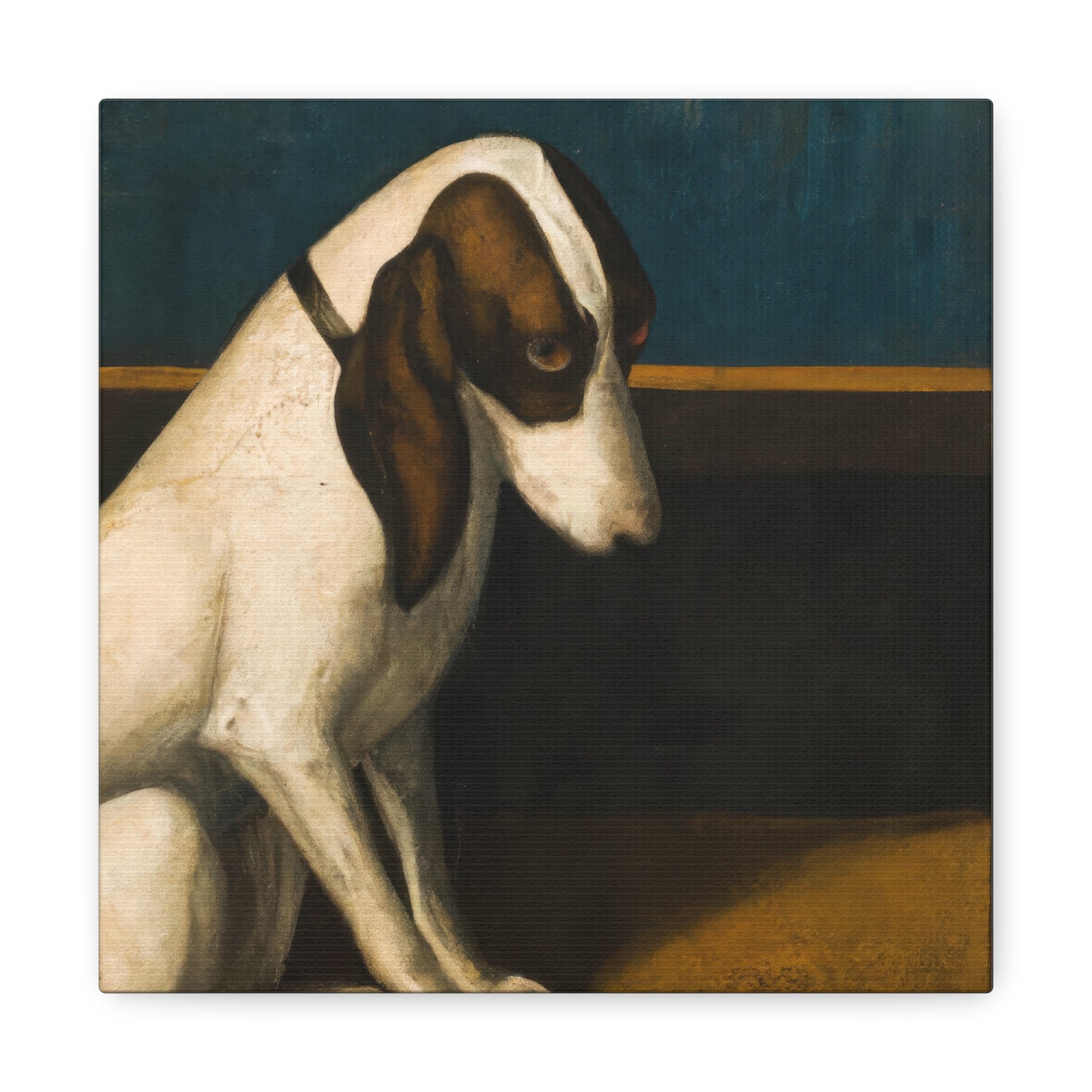 The painting depicts a brown and white dog sitting on the ground, its fur rendered in delicate brushstrokes. The dog's eyes are particularly striking, with a close-up of one revealing a warm brown hue. The background is divided into two distinct sections: the top half is a deep blue color, while the bottom half features a brown field. The field is textured with various shades of brown, creating an impressionistic effect that contrasts with the dog's more detailed rendering. In one corner of the painting, a small section zooms in on the dog's face, emphasizing its expressive features. Overall, the painting has an intimate quality that captures the essence of man's best friend.