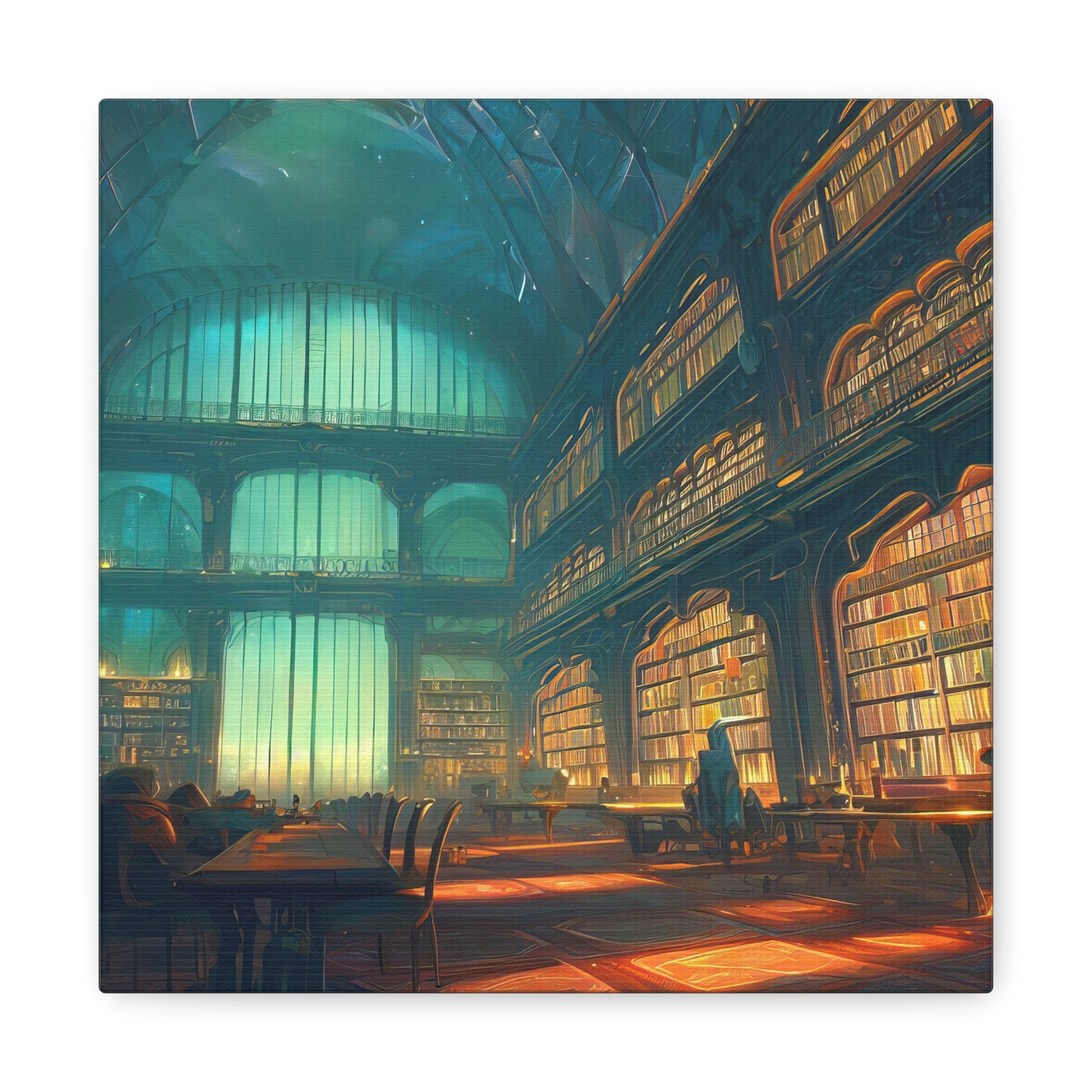 The image depicts a grand library, with walls of stocked bookshelves stretching to the ceiling. The library occupies much of the image, but several other scenes can be observed throughout. In the foreground, a largely empty space contains several pieces of furniture, including a thick leather armchair and a wooden end table. Behind the armchair, a glass window looks out onto an unknown view.
