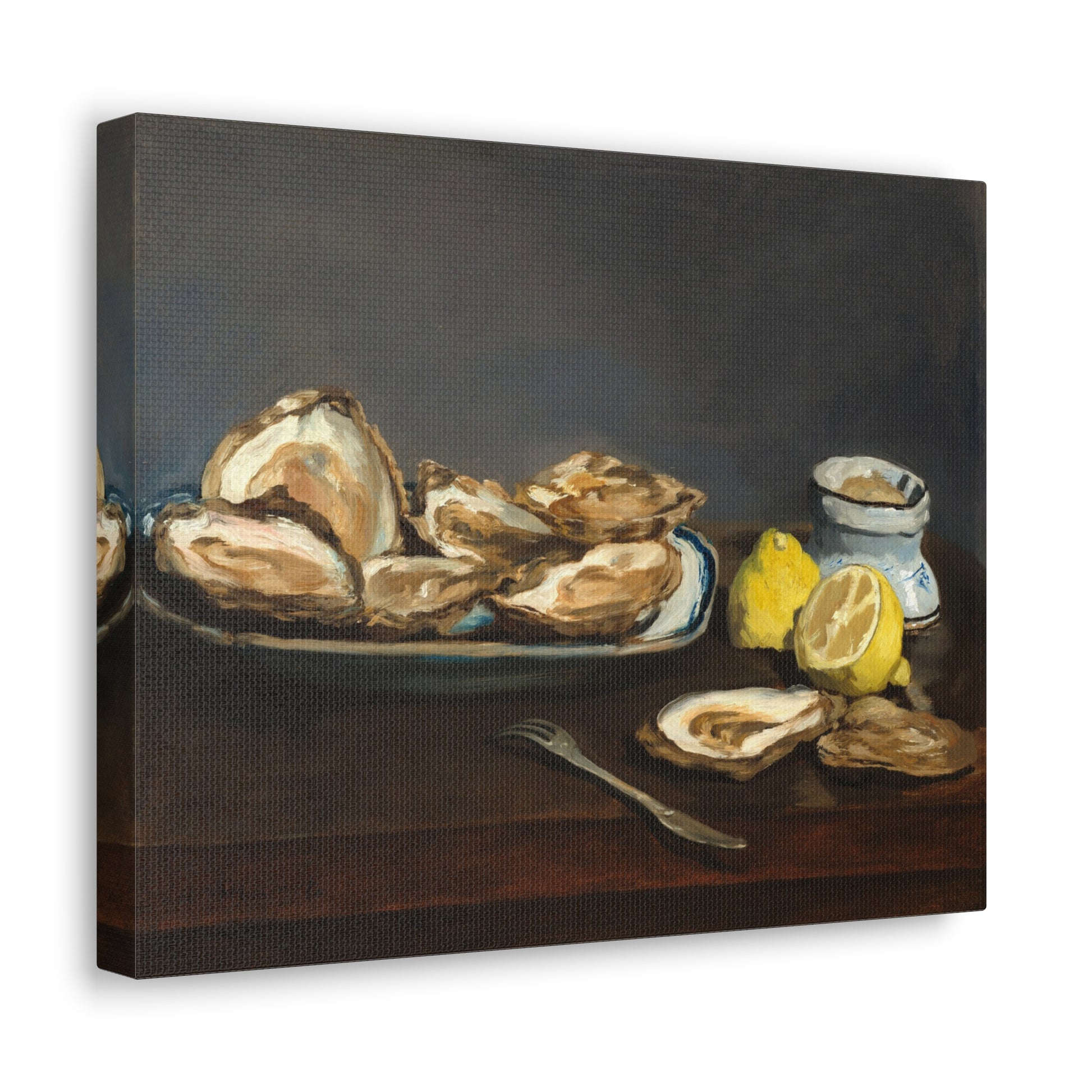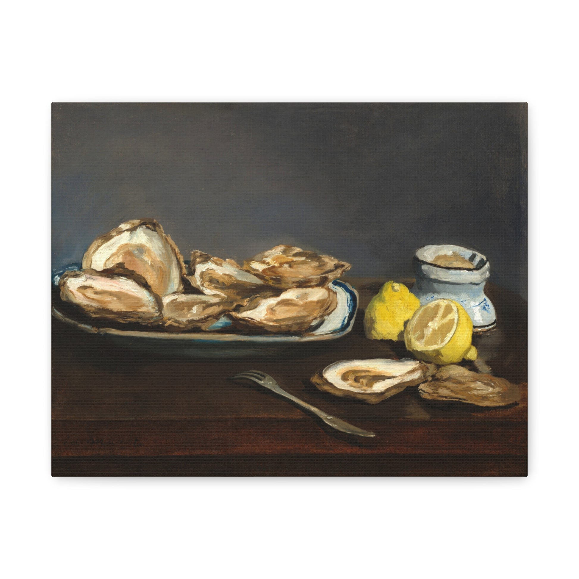 In a well-lit room adorned with paintings, an exquisite arrangement of oysters and lemons is presented on a plate, drawing the eye with its vibrant colors. The plate is accompanied by a delicate bowl of butter, with a spoon resting beside it. A close-up view of a painting on the wall showcases a storm captured in vivid brushstrokes. Adjacent to the painting, a lemon is depicted with intricate detail, its yellow hue shining through. Another painting depicts a charming yellow bird, adding a touch of whimsy to the scene.