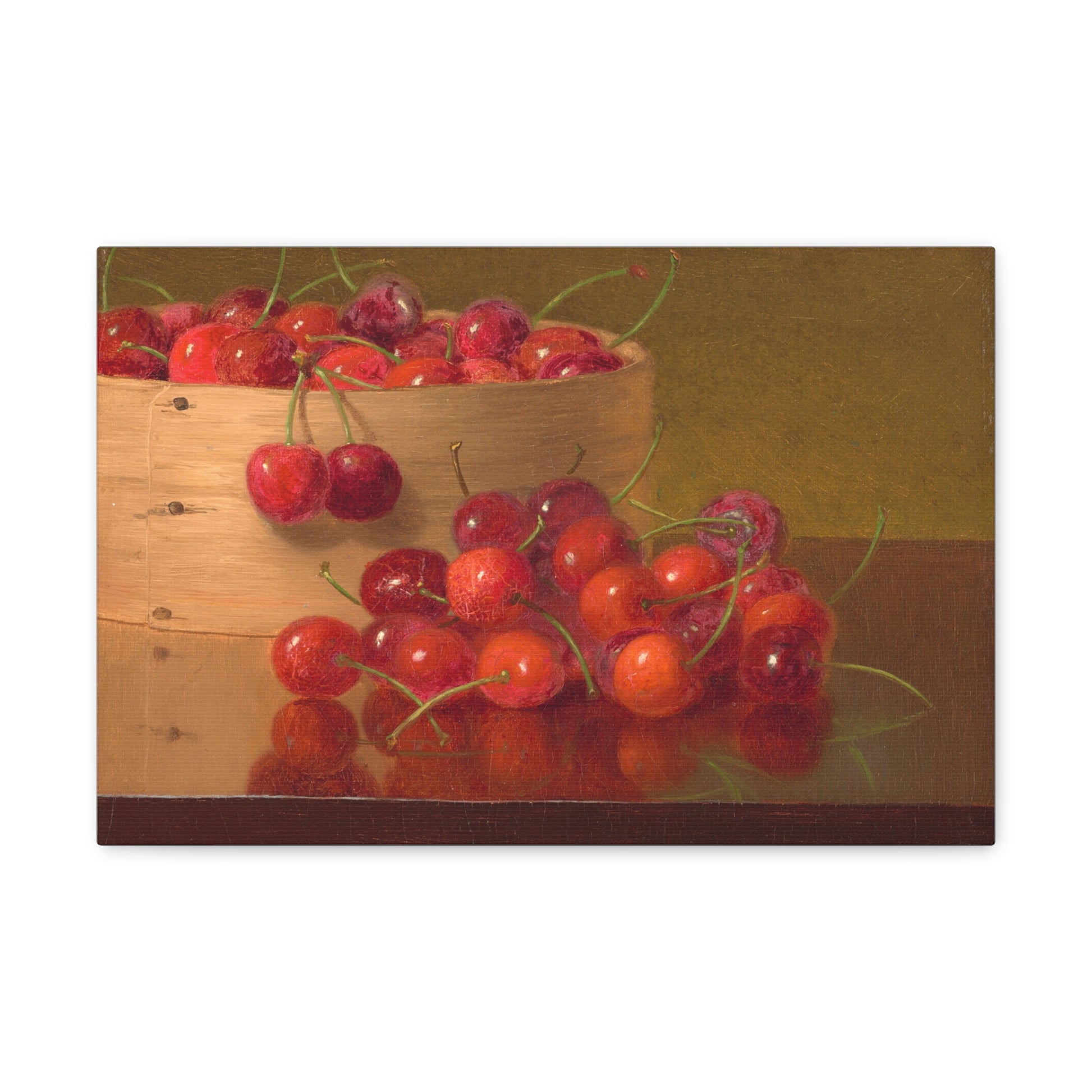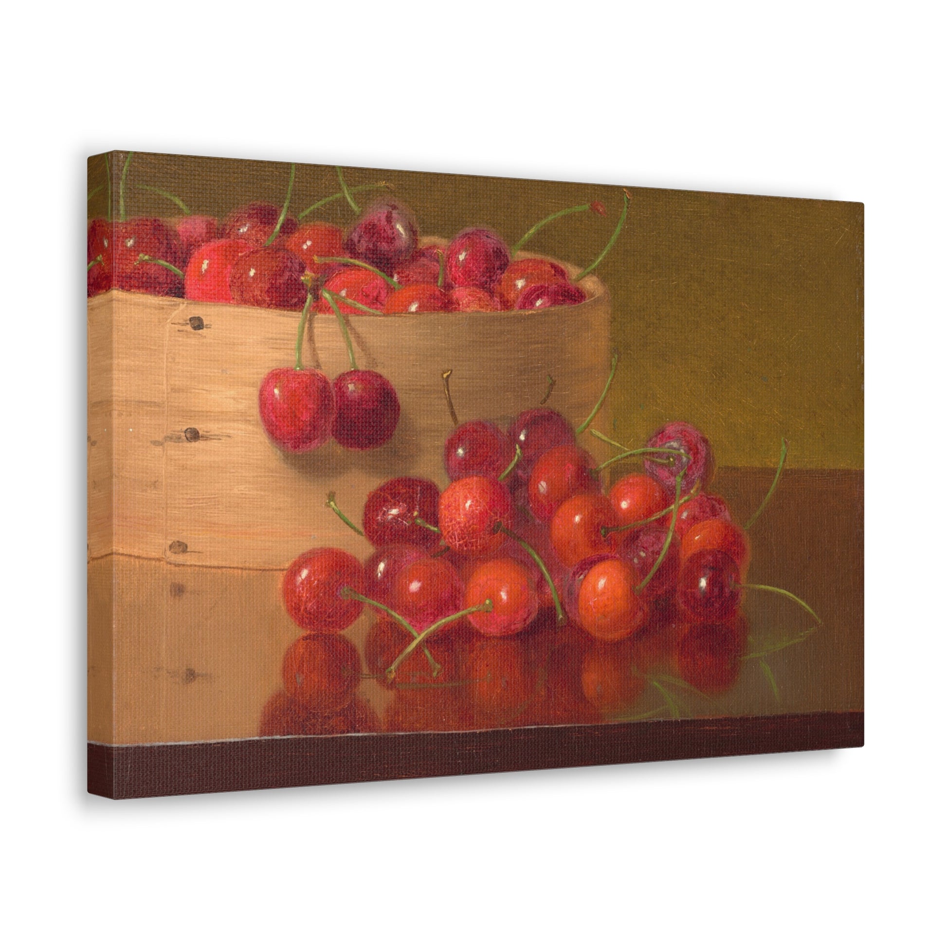Amidst an artistic backdrop of what appears to be a painting or mural, a charming scene unfolds. A simple wooden table is adorned with a bowl of luscious red cherries, their vibrant hues contrasting against the neutral tones of the table's surface. Close by, a bowl of similar cherries is featured prominently in the painting that adorns the wall. Neatly arranged beside the table are various fruits, including a red ball, an orange, and a red apple. Each fruit boasts its own unique shape and color, forming a colorful display that adds a touch of whimsy to the scene.