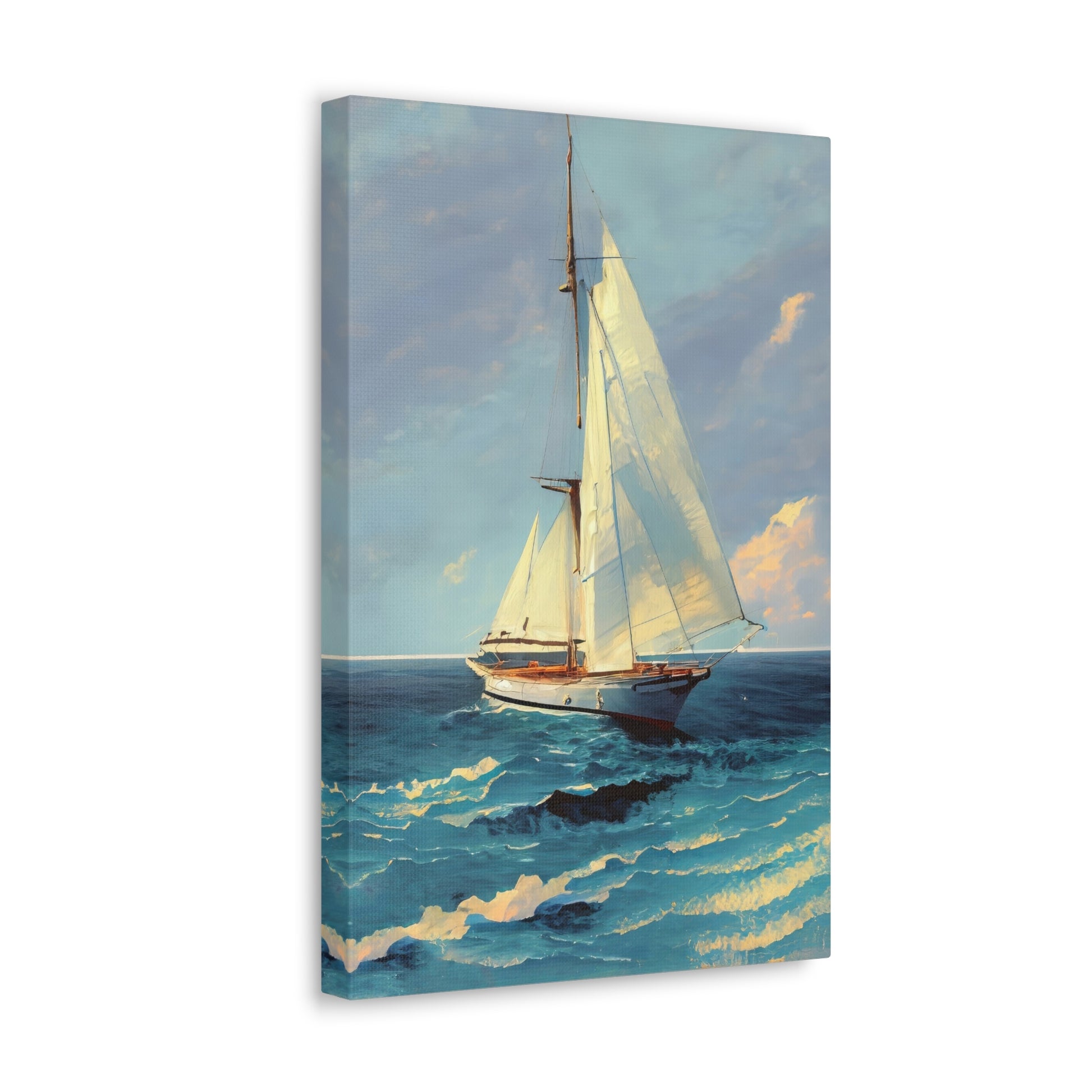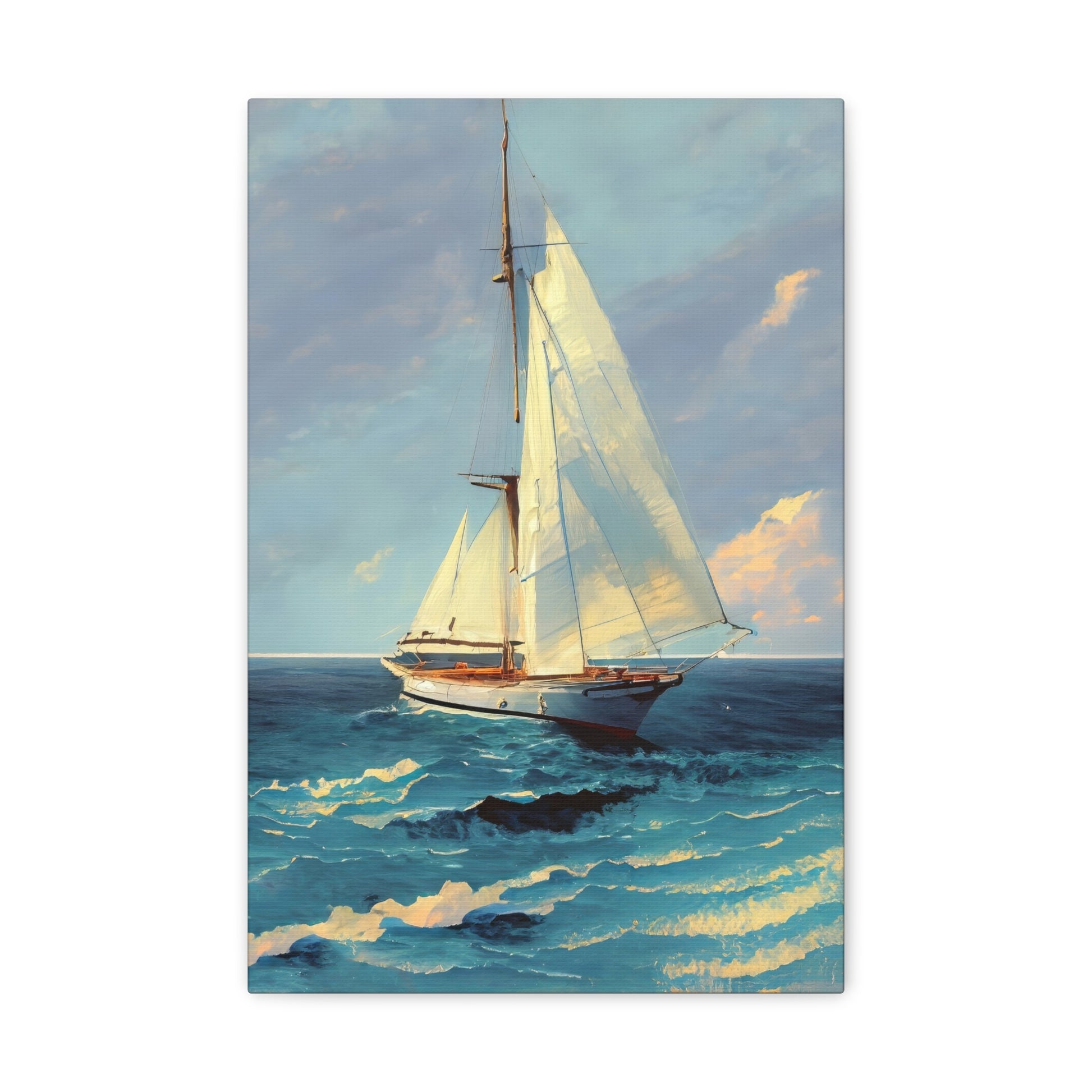 A stunning ocean painting dominates the scene, depicting a majestic sailboat sailing on the open water. The sailboat is rendered in exquisite detail, with white sails billowing in the wind against a background of serene blue waves.