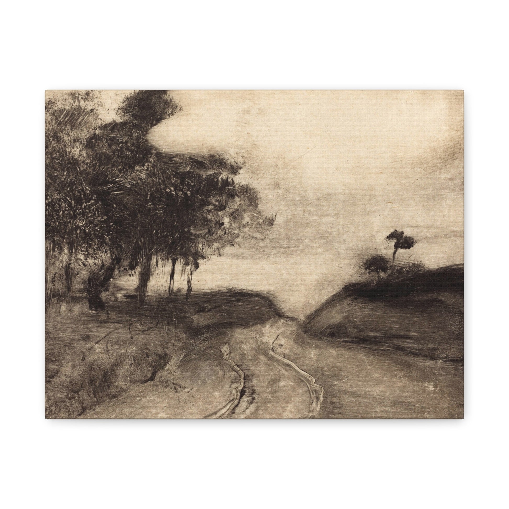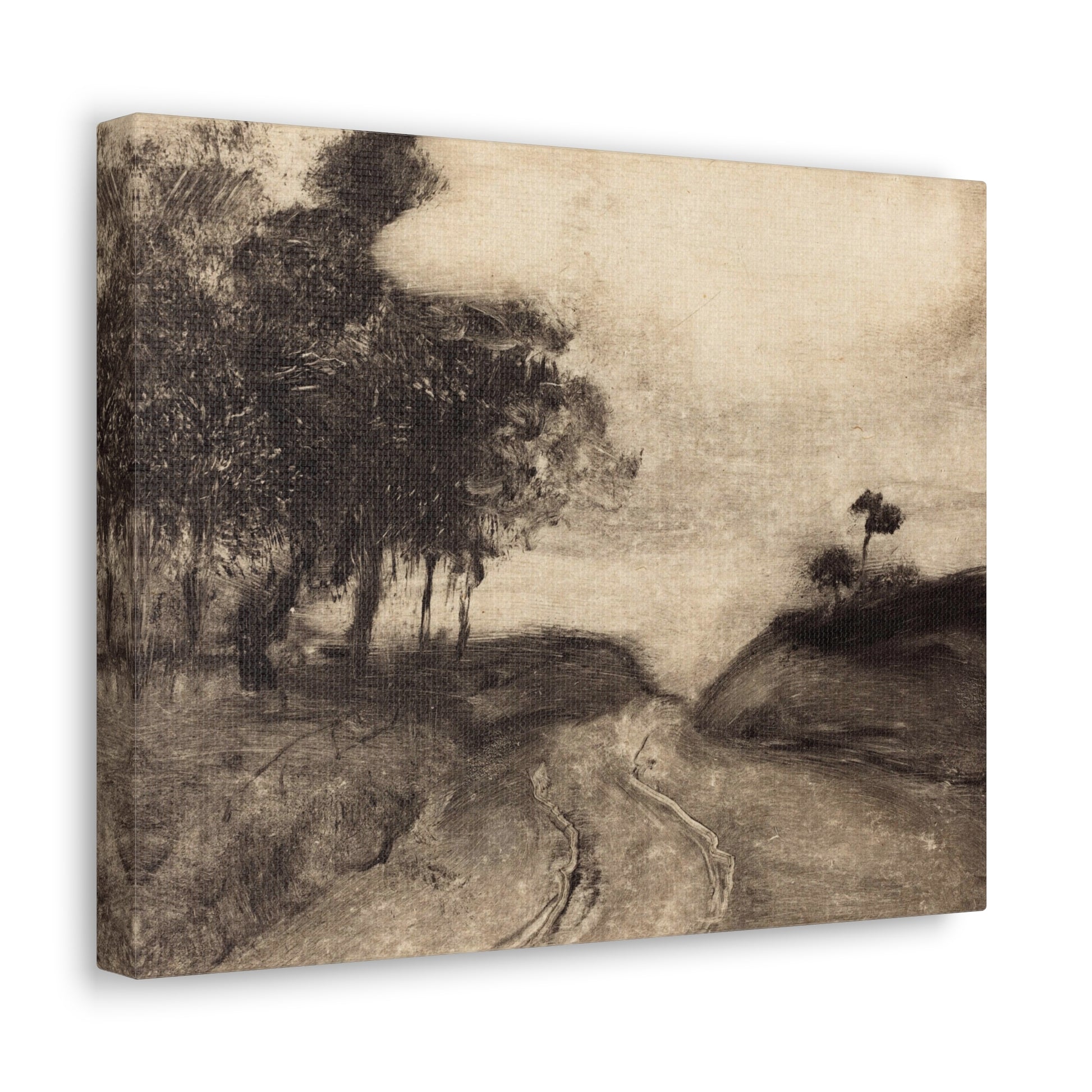 In a captivating, black and white drawing, an idyllic scene unfolds. A winding road stretches from the foreground to the background, passing through a dense forest of towering trees. The road is depicted with meticulous detail, displaying the contrasting tones and textures of the surrounding landscape. Amongst the trees, a majestic horse stands proudly, its powerful form showcased in a striking pose. The horse is portrayed with impressive accuracy, capturing its strength and beauty. It serves as a focal point in the composition, drawing the viewer's attention to its graceful presence. The trees, abundant and varied in size, dot the landscape, creating a sense of depth and dimension. They stand tall and strong in their simplicity, their branches reaching towards the sky. Some trees appear on a hill, adding visual interest and enhancing the overall composition.