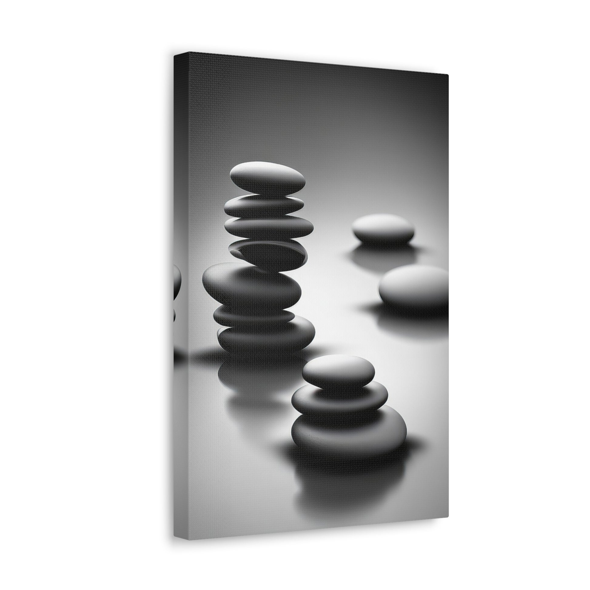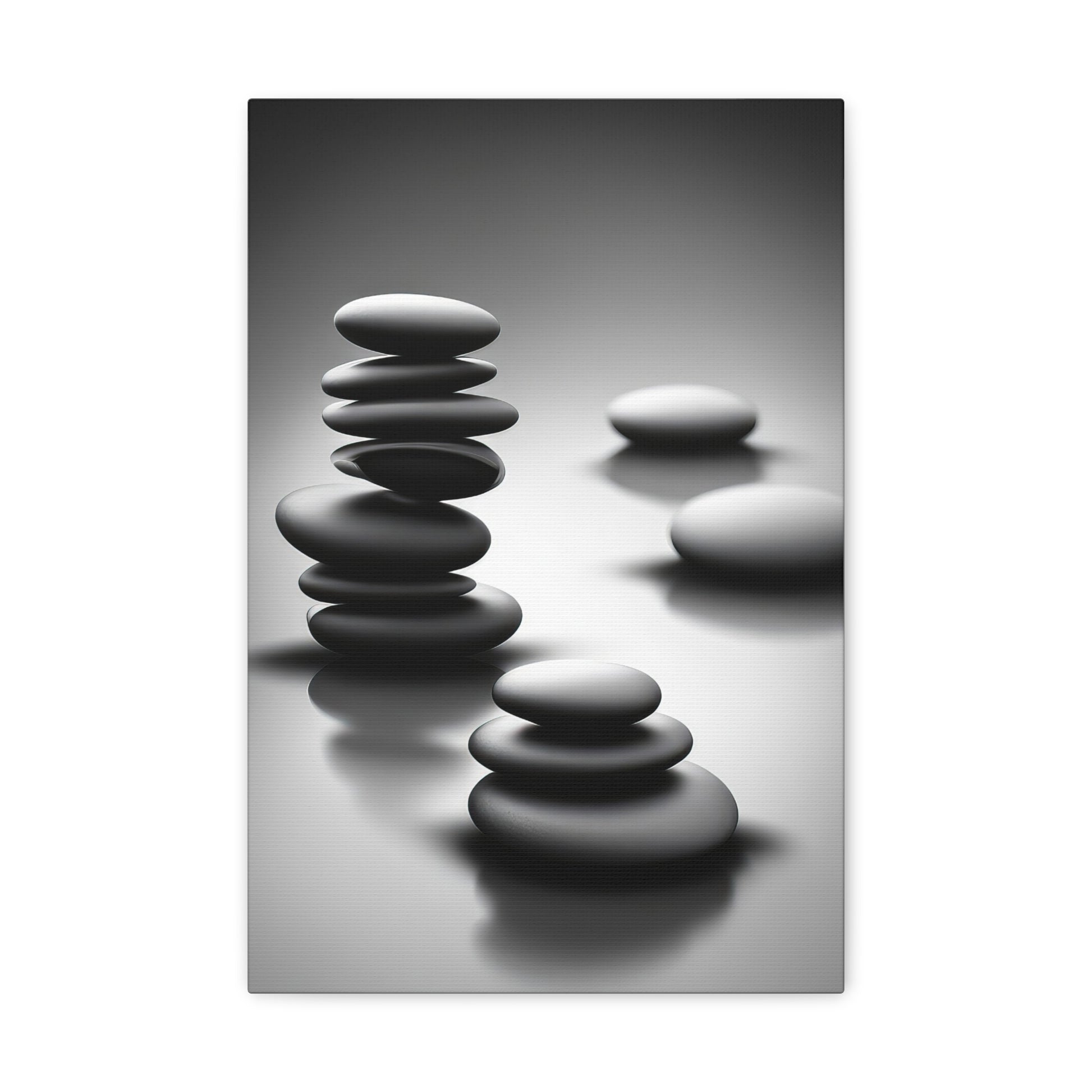 A stark black and white composition dominates the picture, featuring an assortment of pebbles and sculptures arranged on white and grey backgrounds. The upper half of the image showcases a balanced yet contrasting tableau of black and white stones stacked on top of one another, emanating a sense of harmony and balance.